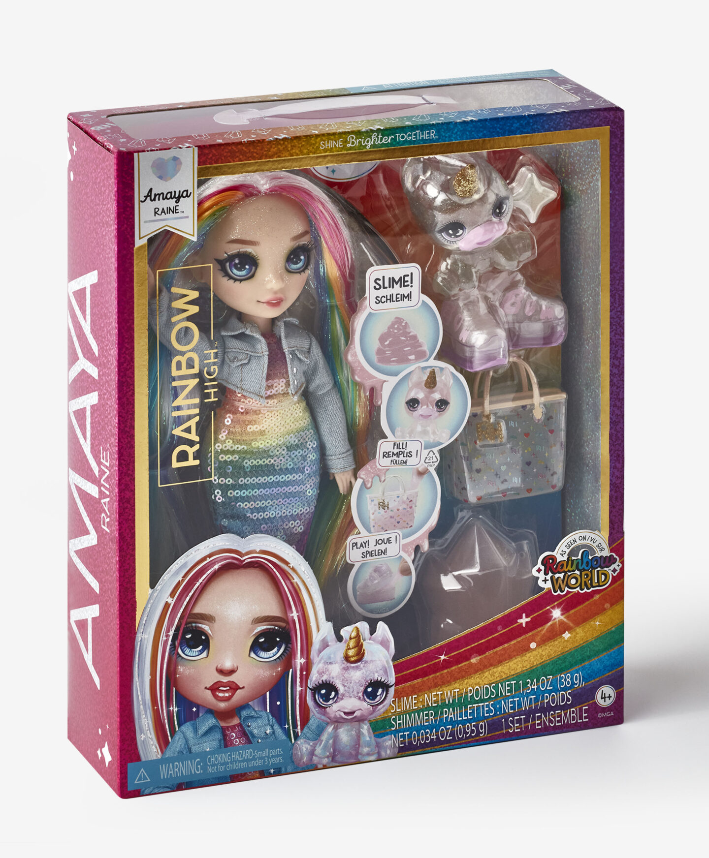 Bábika Rainbow High Amaya Raine oslňuje žiarivými farbami a svojím charakteristickým dúhovým štýlom. Jej dlhé vlasy sa trblietajú vo viacerých odtieňoch a jej outfit je plný trblietavých detailov, ktoré jej dodávajú skutočne jedinečný vzhľad. Súprava obsahuje aj doplnky ako zvieratko alebo sliz, ktoré spestria hranie. Čas strávený s ňou podnecuje fantáziu a ponúka deťom neobmedzené možnosti kreatívneho vyjadrenia.