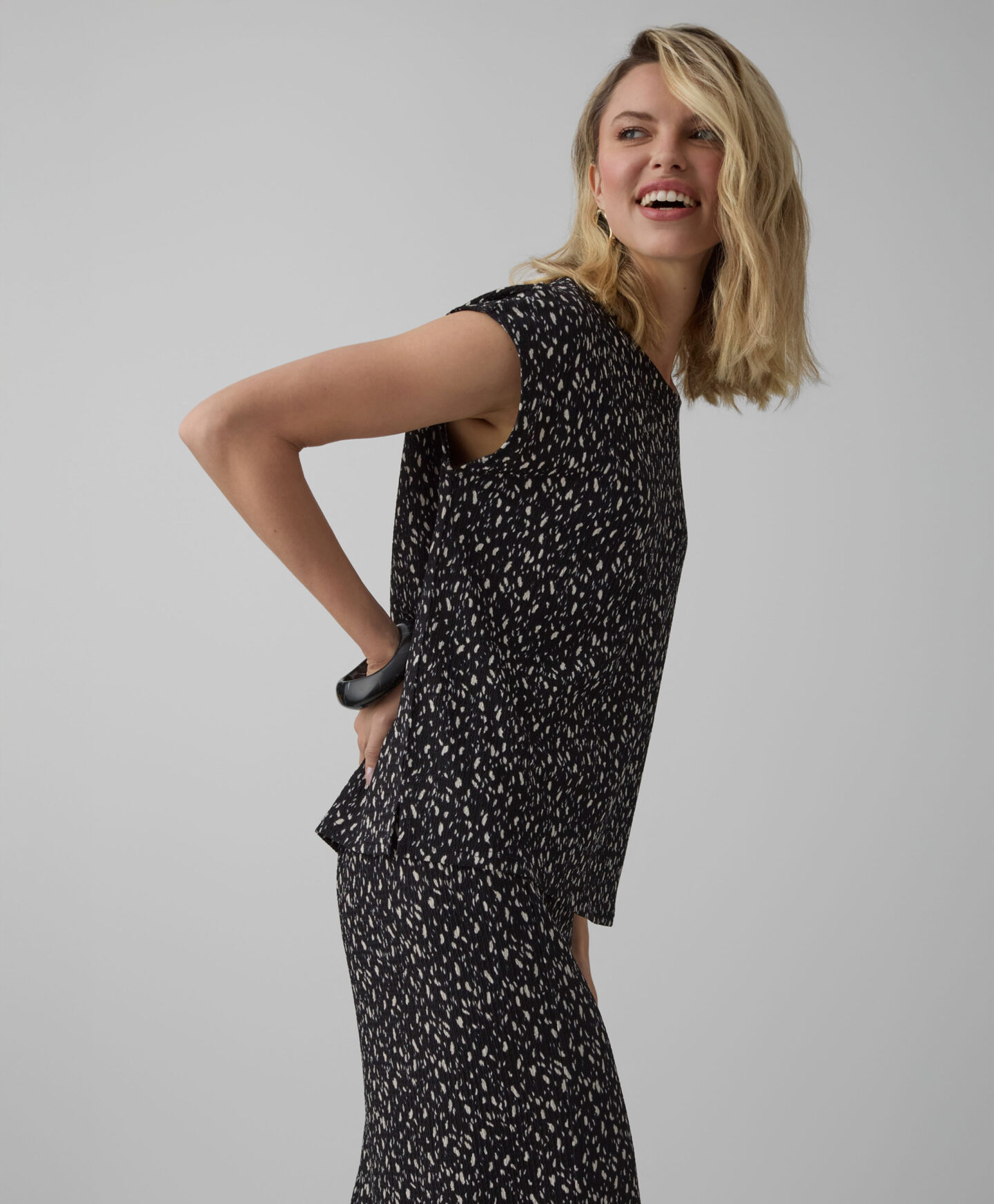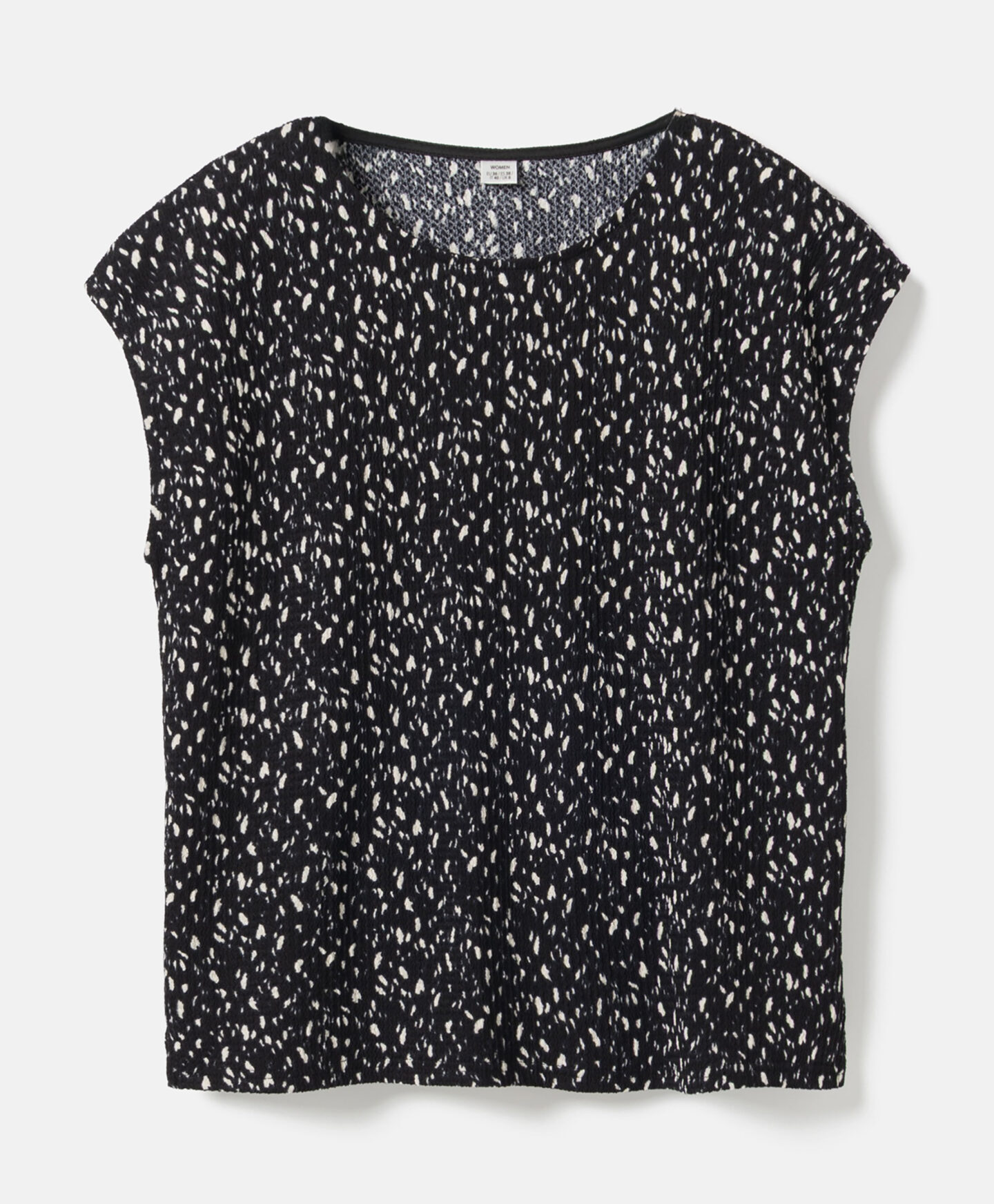 Dámska čierna vzorovaná košeľa s pokrčeným vzhľadom tvorí súpravu so sukňou z kolekcie. Môžete ju však ľubovoľne kombinovať aj s vašimi obľúbenými džínsami alebo elegantnejšími nohavicami. Krátky rukáv je ideálny na vrstvené nosenie v prechodných obdobiach. Hodí sa ku klasickej bunde aj k jednofarebnému kardigánu.
