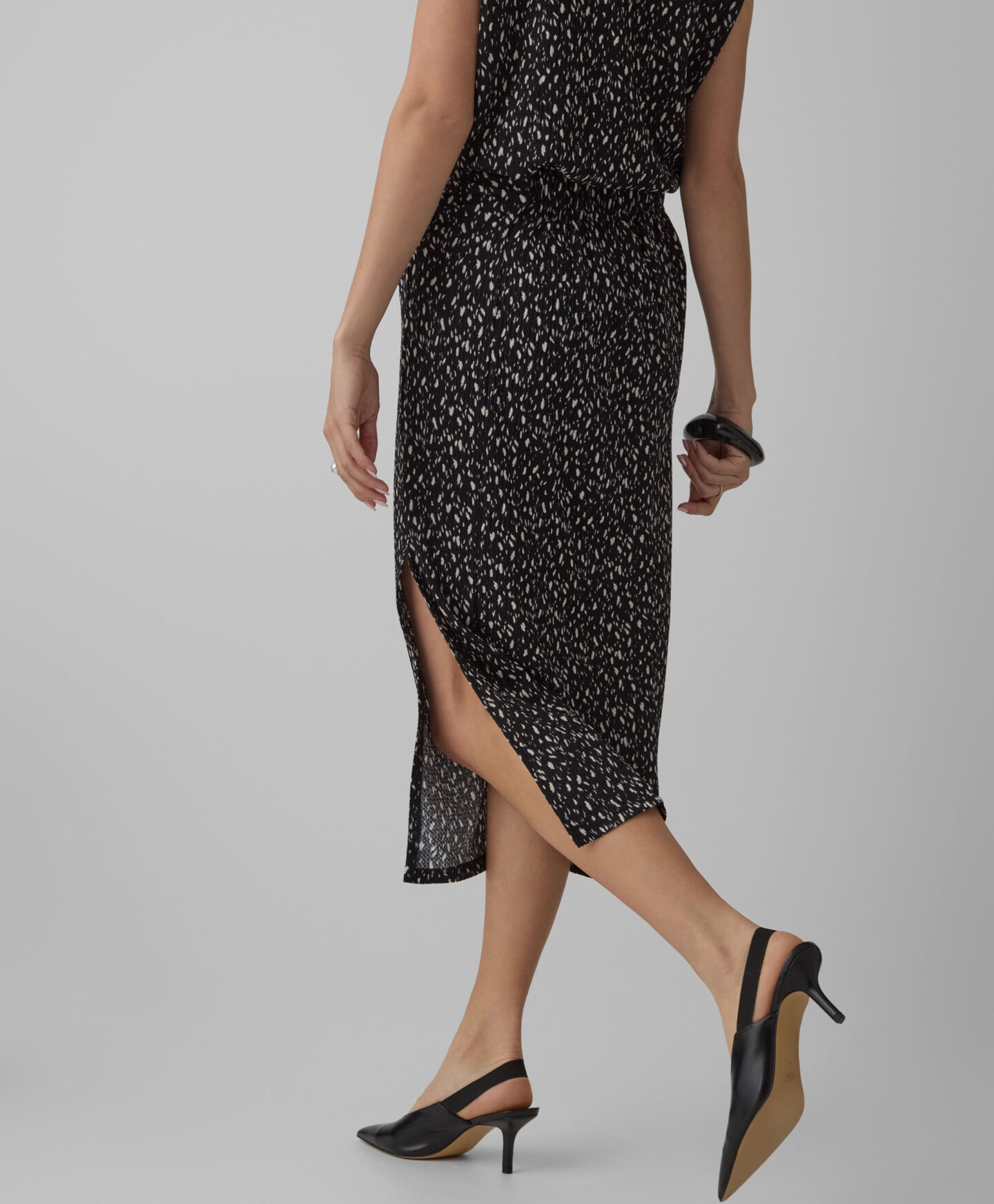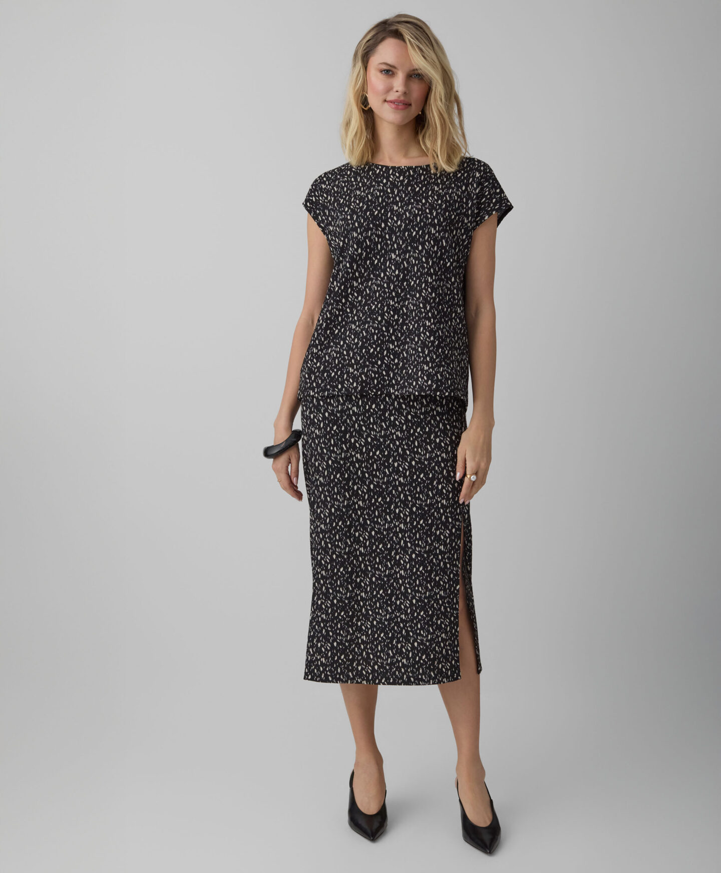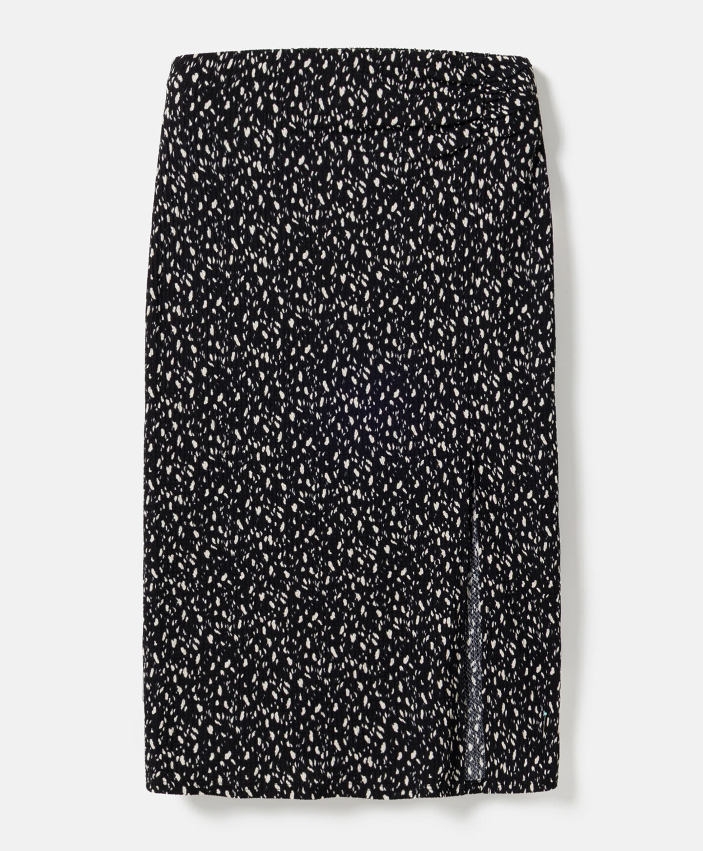 Dámska sukňa s pokrčeným vzhľadom vytvára súpravu s košeľou s krátkym rukávom z kolekcie. Nepravidelný vzor upúta pozornosť a vďaka nemu bude sukňa vo vašom šatníku vynikať. Rázporok zvýrazní vaše najlepšie črty a opticky predĺži nohy. Sukňa je ľahká, príjemná na dotyk a odolná voči praniu.
