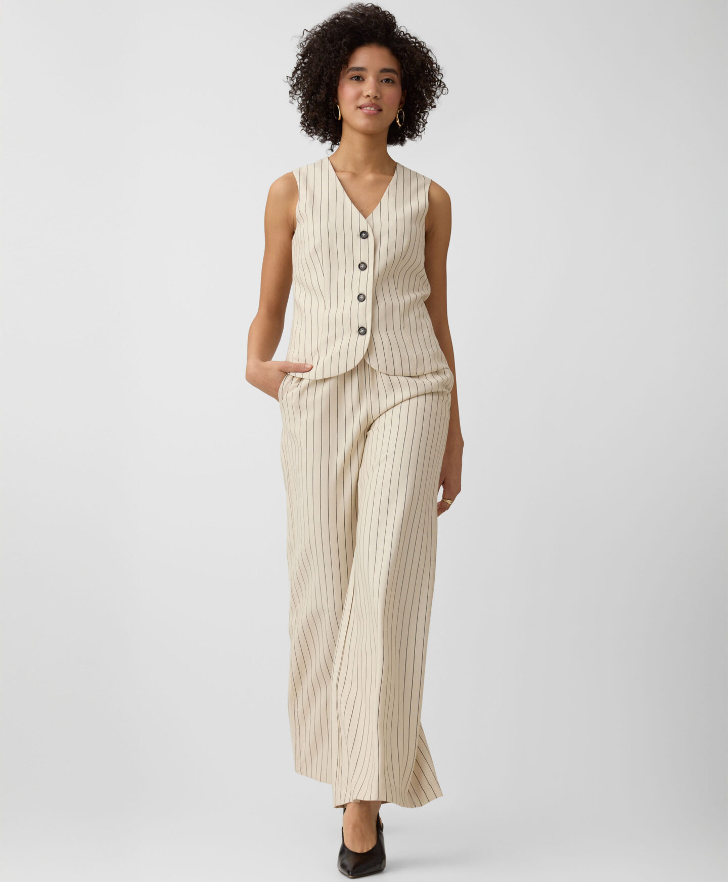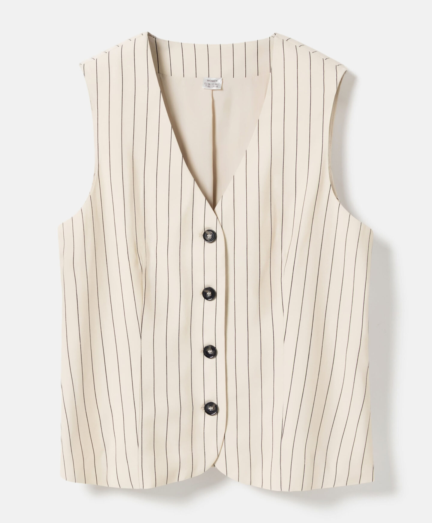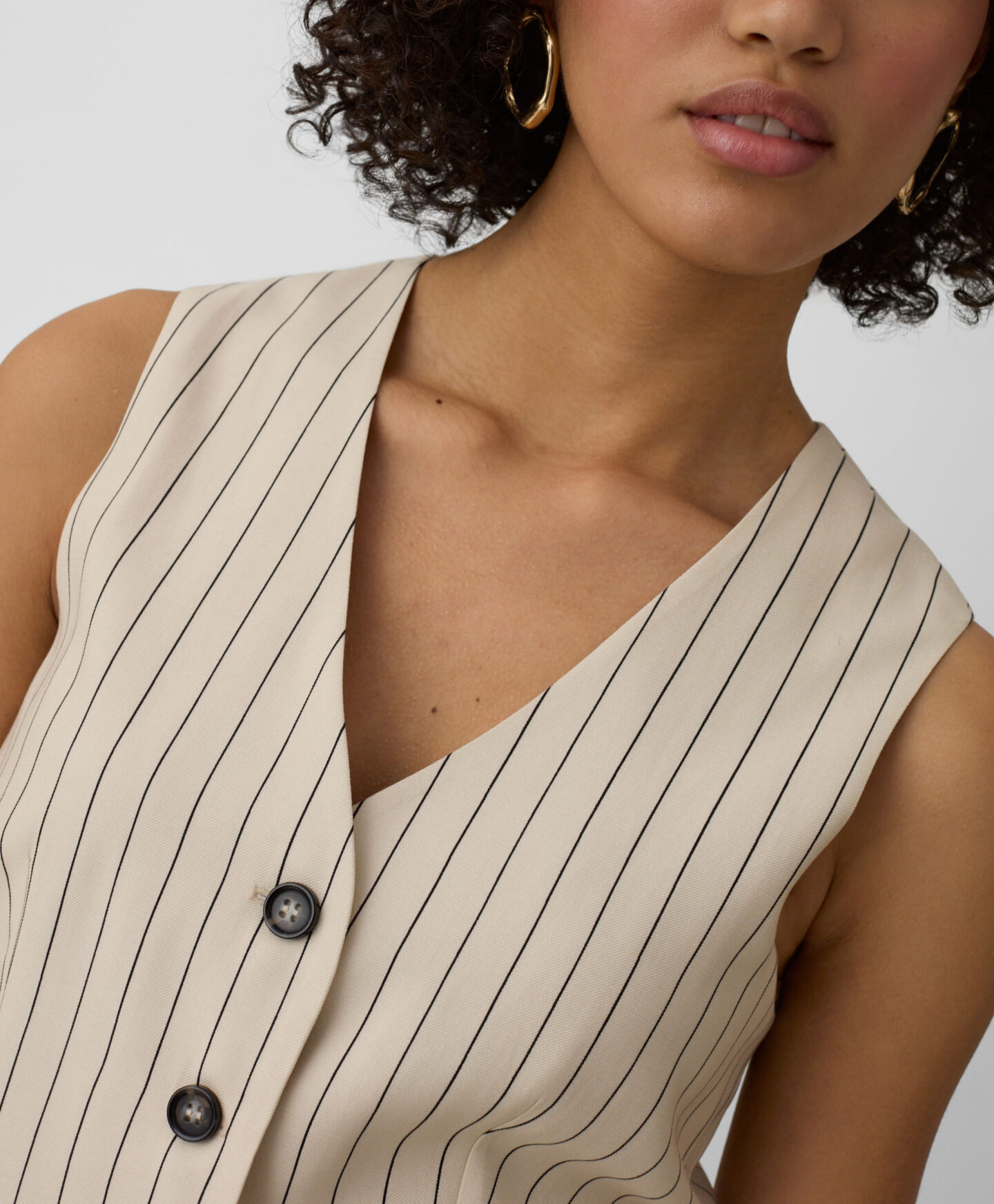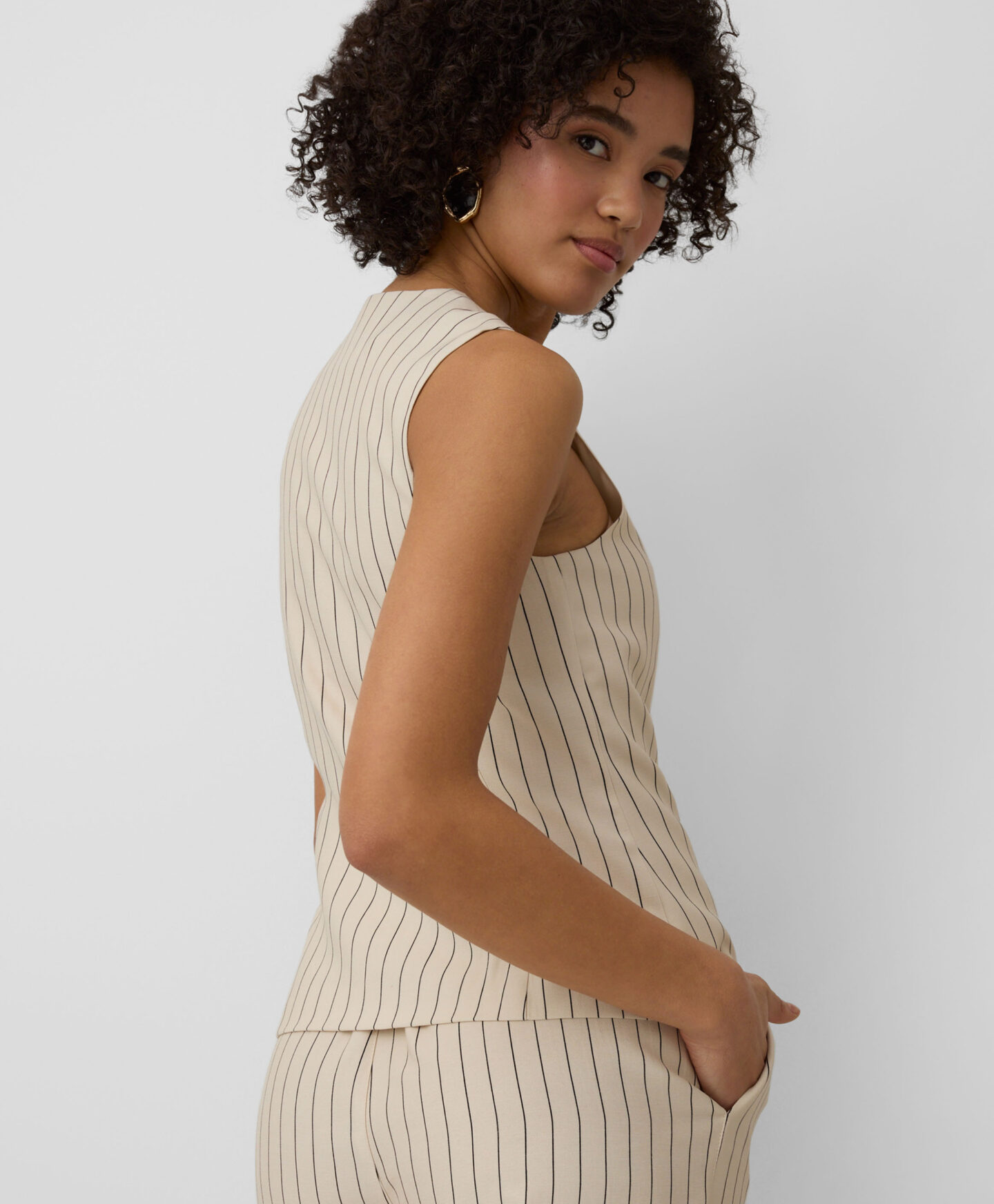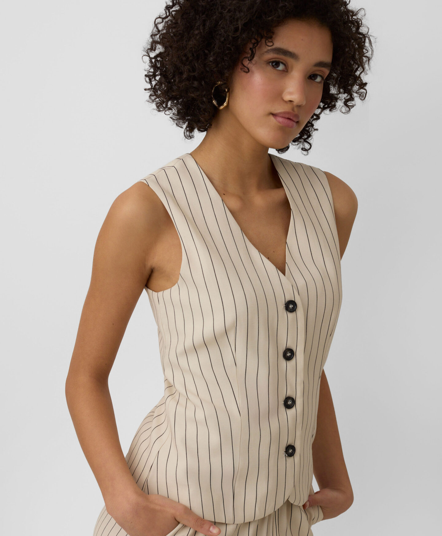 Táto dámska pruhovaná vesta sa perfektne hodí k nohaviciam z tejto kolekcie. Vďaka vysokému obsahu viskózy je vesta ľahká, vzdušná a ideálna na teplé dni. Tlmená farebná schéma ju robí neuveriteľne všestrannou pre styling.