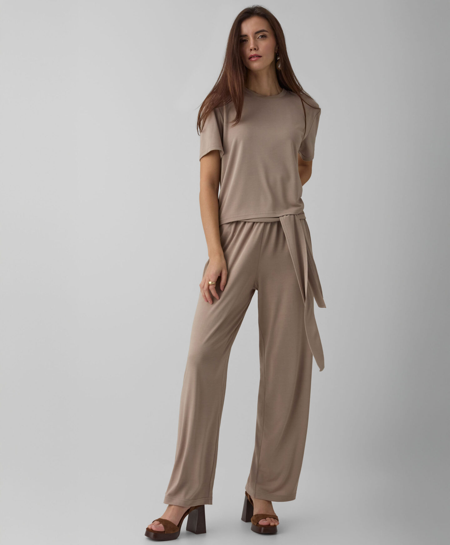 Dámske béžové tričko s krátkym rukávom tvorí súpravu s nohavicami s viazaním v páse, ale bude sa krásne hodiť k väčšine oblečenia vo vašom šatníku. To všetko vďaka klasickému strihu a nadčasovej farbe, ktoré nikdy nevyjdú z módy. Ľahký materiál s viskózou je ľahký a príjemný na dotyk. Tričko vám zaručí pohodlie počas celého dňa nosenia. V ponuke je na výber viacero farieb.