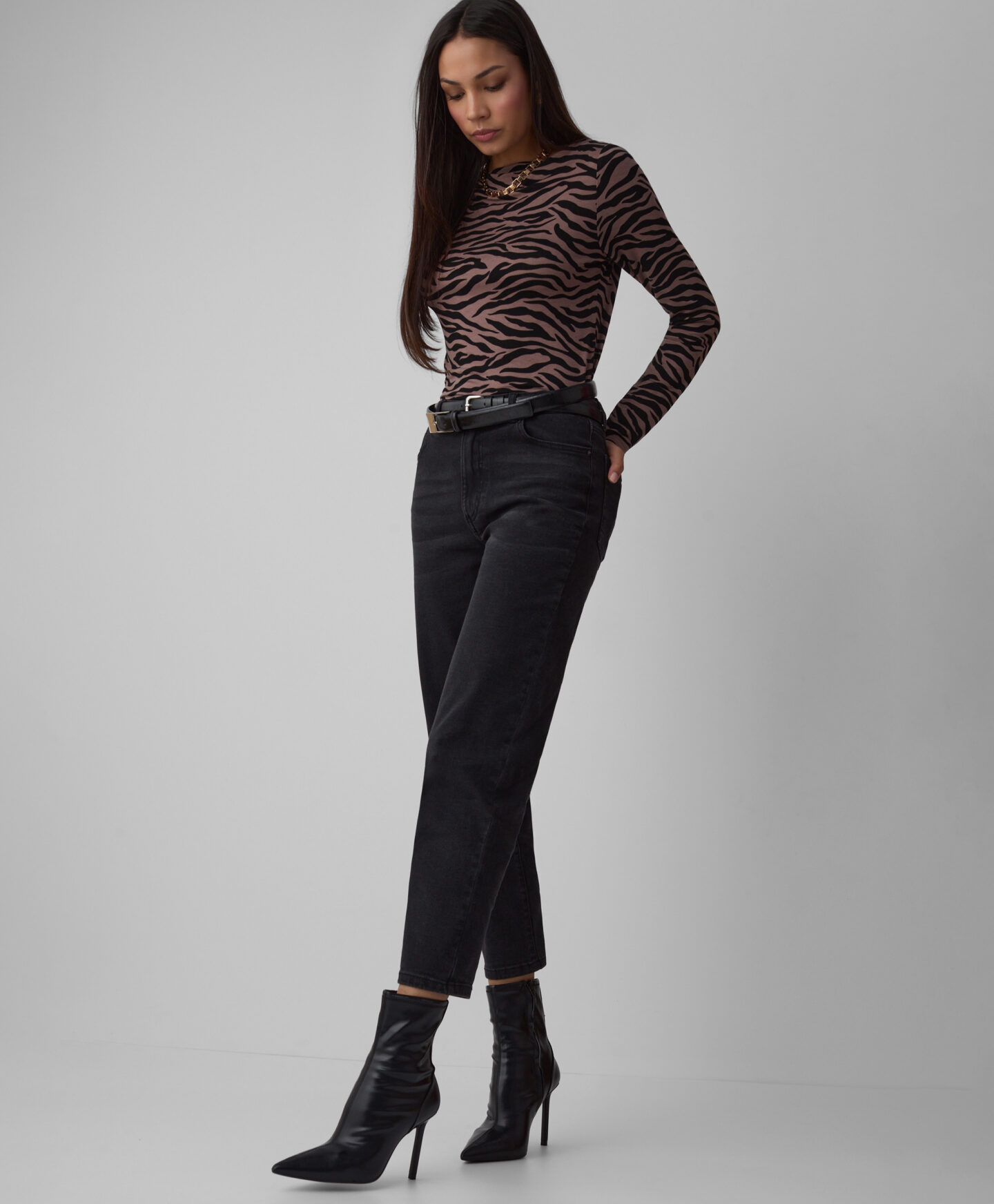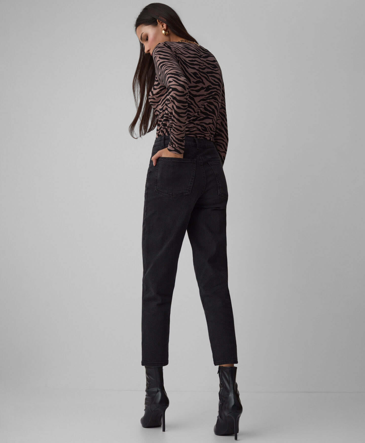 Dámske džínsy strihu mom sú nadčasovým hitom, ktorý spája pohodlie so štýlovým dizajnom. Sú ideálne na každodenné nosenie a hodia sa k voľným tričkám, ležérnym svetrom aj elegantnejším košeliam. Klasická čierna farba ich umožňuje kombinovať s mnohými kúskami šatníka.