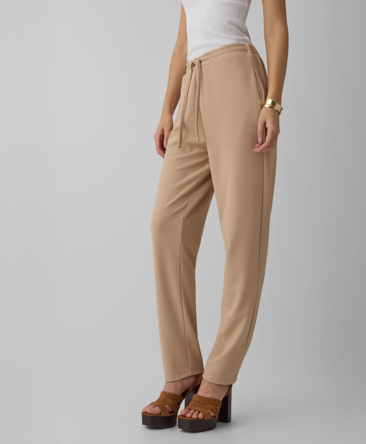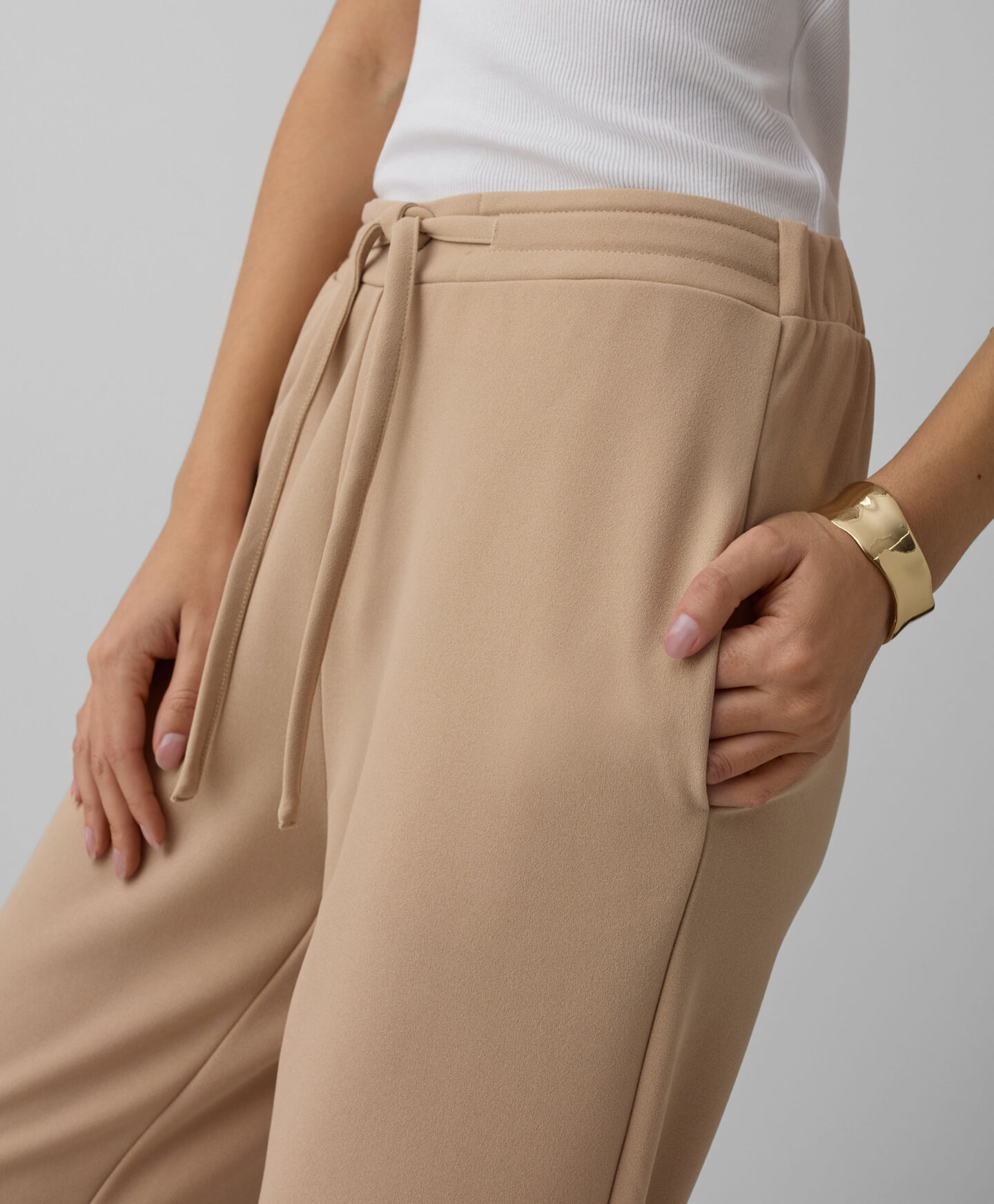 Tieto dámske nohavice s viazaním v páse sú ideálne pre tie, ktoré uprednostňujú klasický štýl každý deň. Všestranná béžová farba umožňuje rôzne možnosti stylingu, od ležérneho až po formálnejší. Ideálne do kancelárie, na formálnu večeru alebo rodinný výlet. V ponuke nájdete aj blejzer z rovnakej kolekcie.