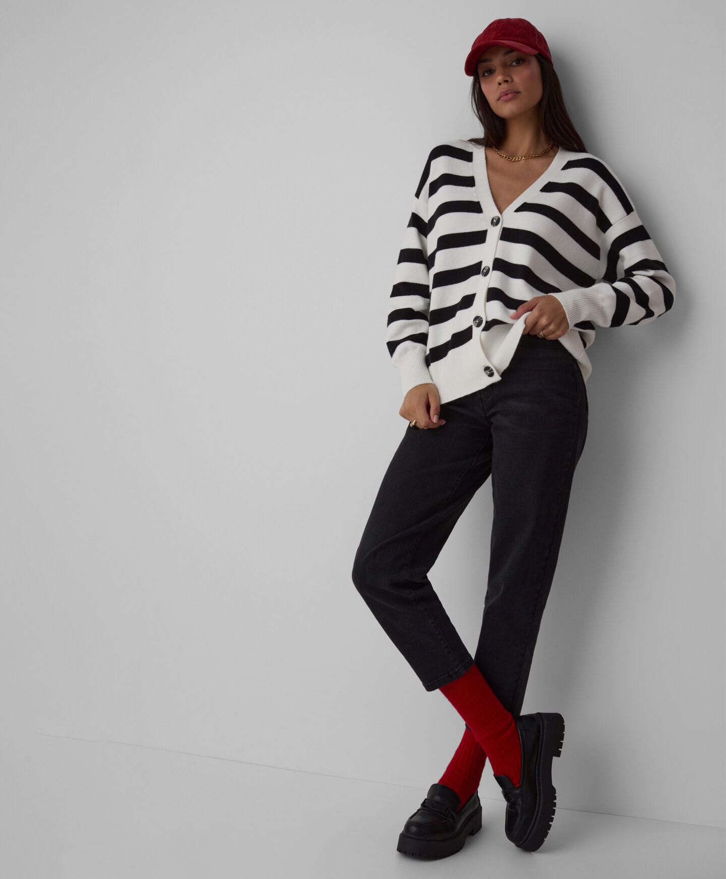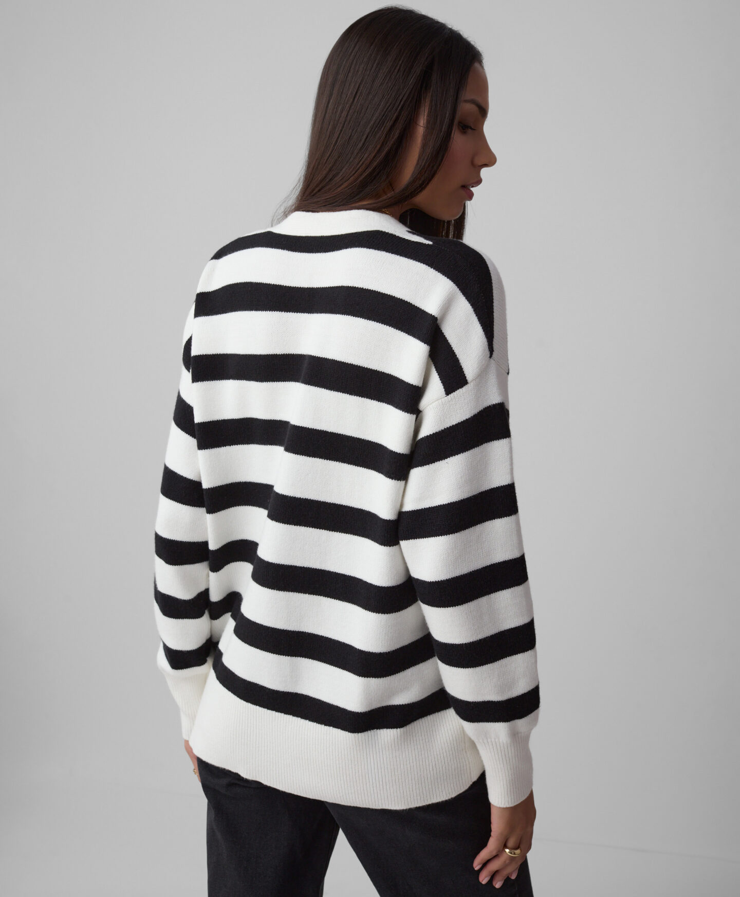 Dámsky kardigán voľného strihu s čiernobielymi pruhmi je ideálny pre milovníčky klasických štýlov v pohodlnom prevedení. Pruhovaný vzor nikdy nevyjde z módy a vyzerá skvele s elegantnými nohavicami aj klasickými džínsami. Mäkký materiál s viskózou jemne obopína pokožku a ponúka teplo v chladných zimných dňoch. Dve farebné varianty na výber.