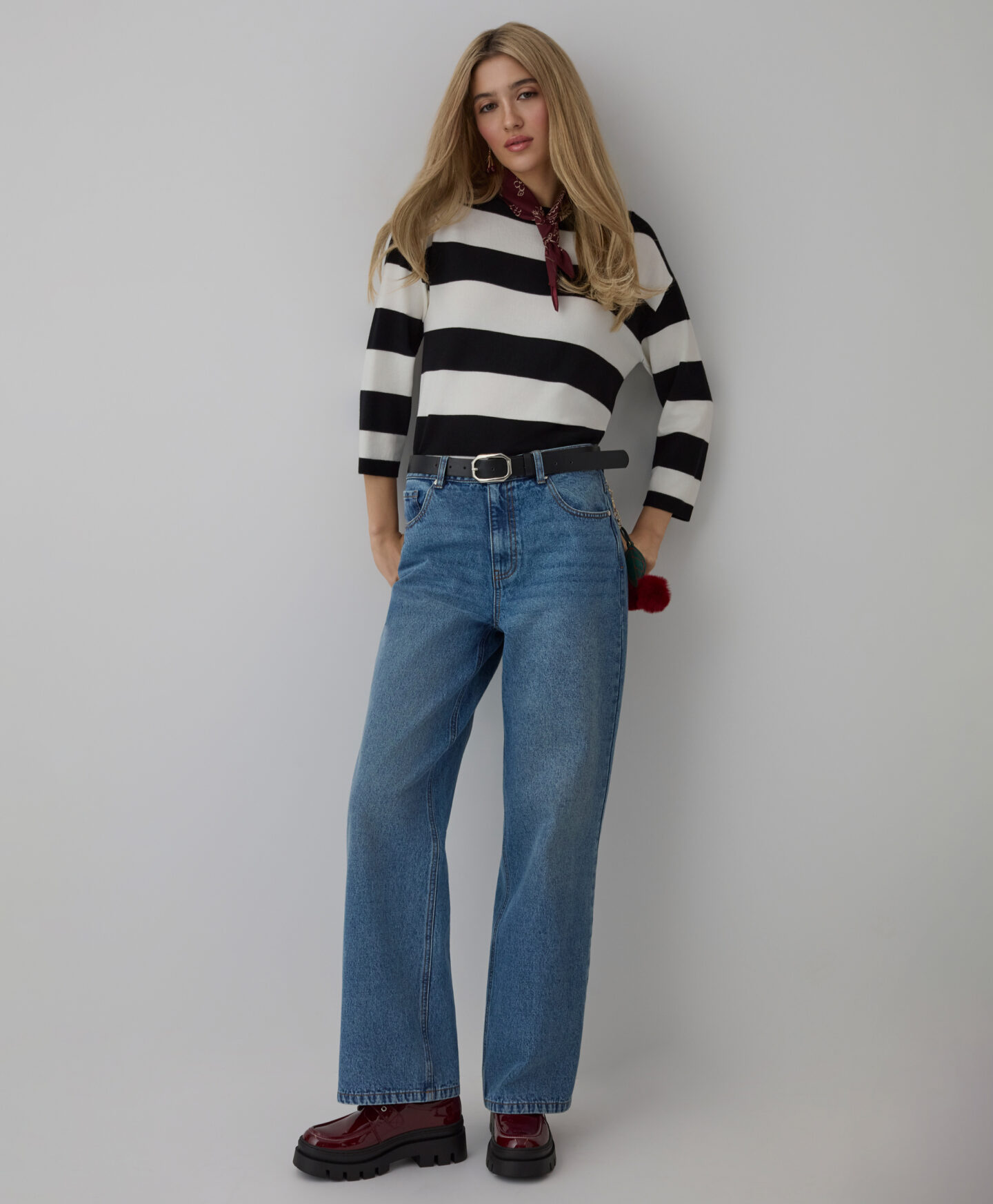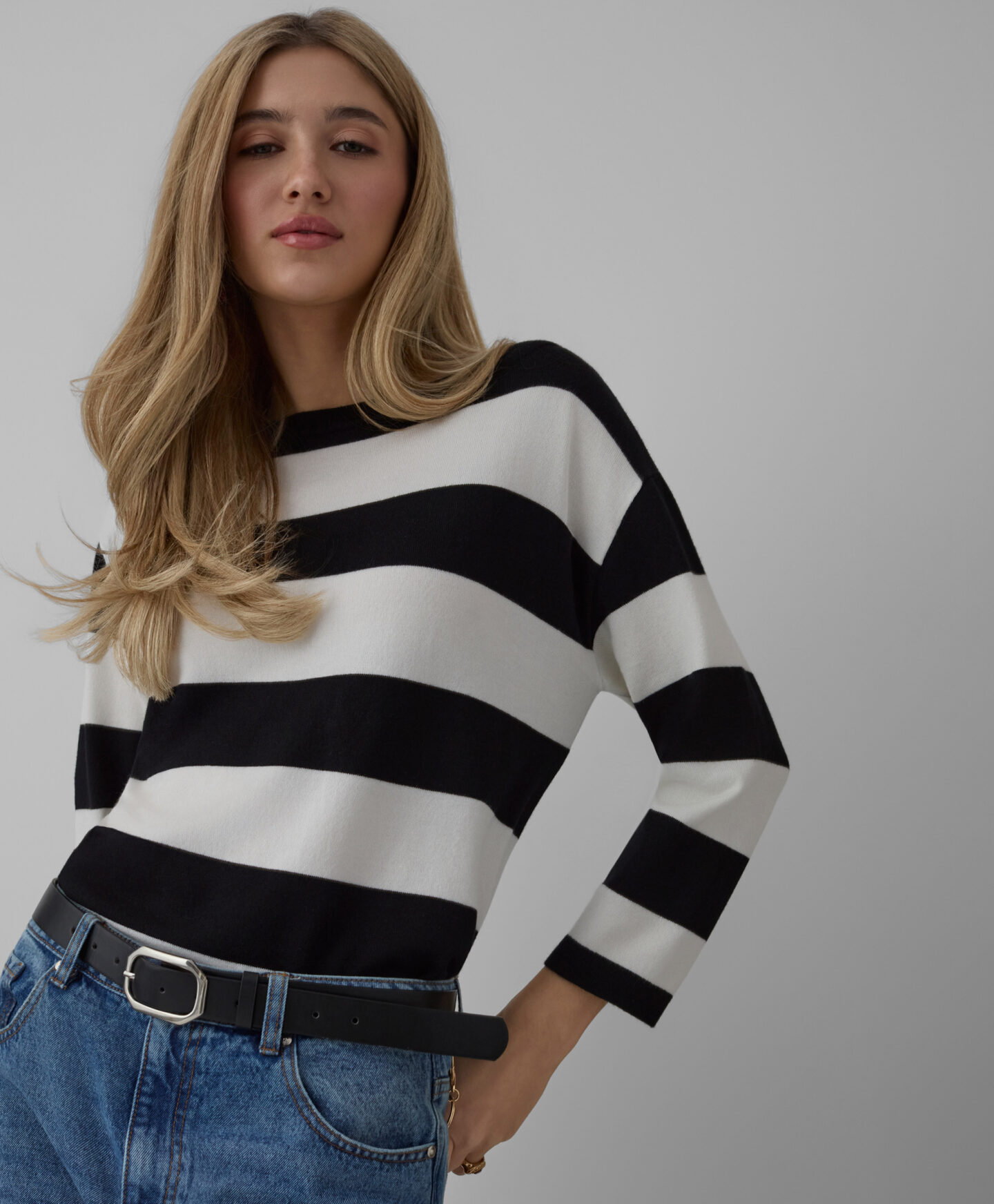 Dámsky pruhovaný pulóver vyniká svojím jedinečným strihom. Prídavok viskózy robí pulóver mäkkým a priedušným, čo poskytuje pohodlie počas celého dňa. Kimonový strih mu dodáva jedinečný charakter a zaisťuje slobodu pohybu.
