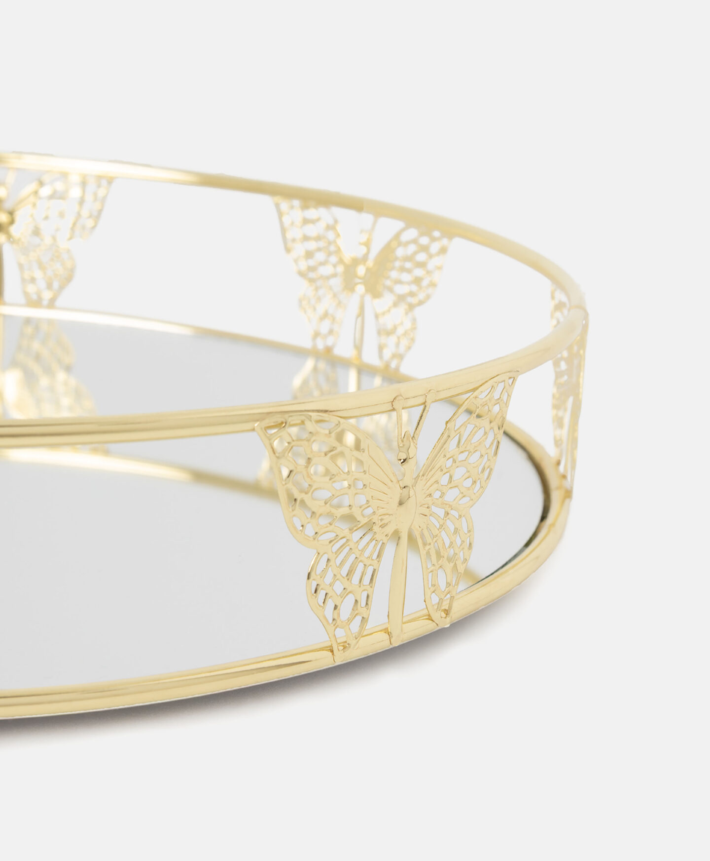 Dekoratívny podnos so zrkadlovým dnom je vkusným doplnkom každého interiéru. Bude ozdobou vašej obývačky, spálne alebo kuchyne. Vyzerá skvele ako podstavec pre vonné sviečky a vázy, ale hodí sa aj na servírovanie nápojov a sladkostí. Zlatý motív motýľa dodáva podnosu veľmi ľahký vzhľad a zrkadlo krásne odráža svetlo.