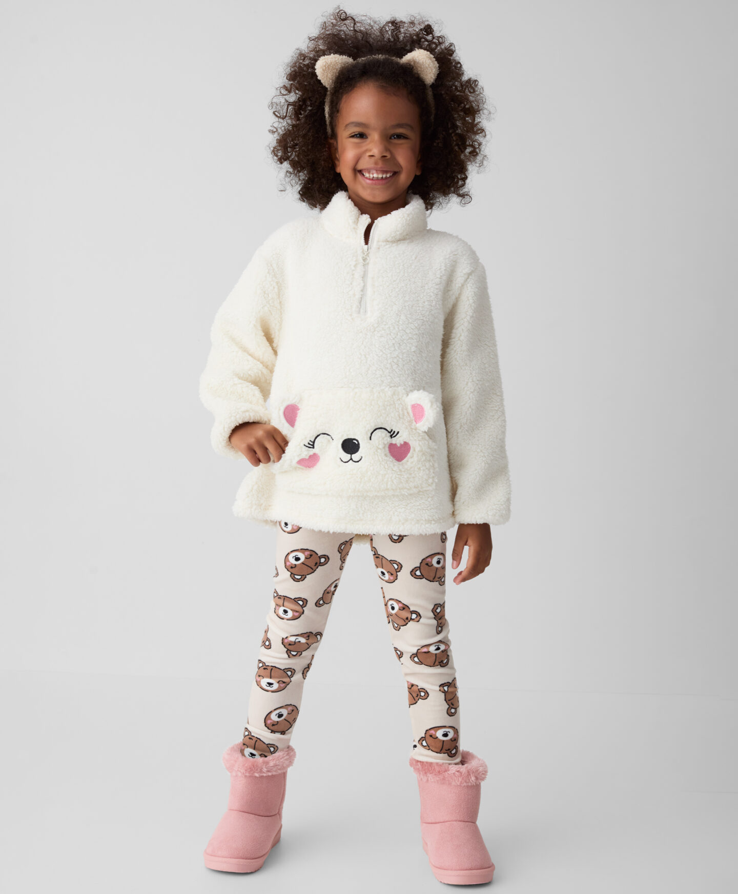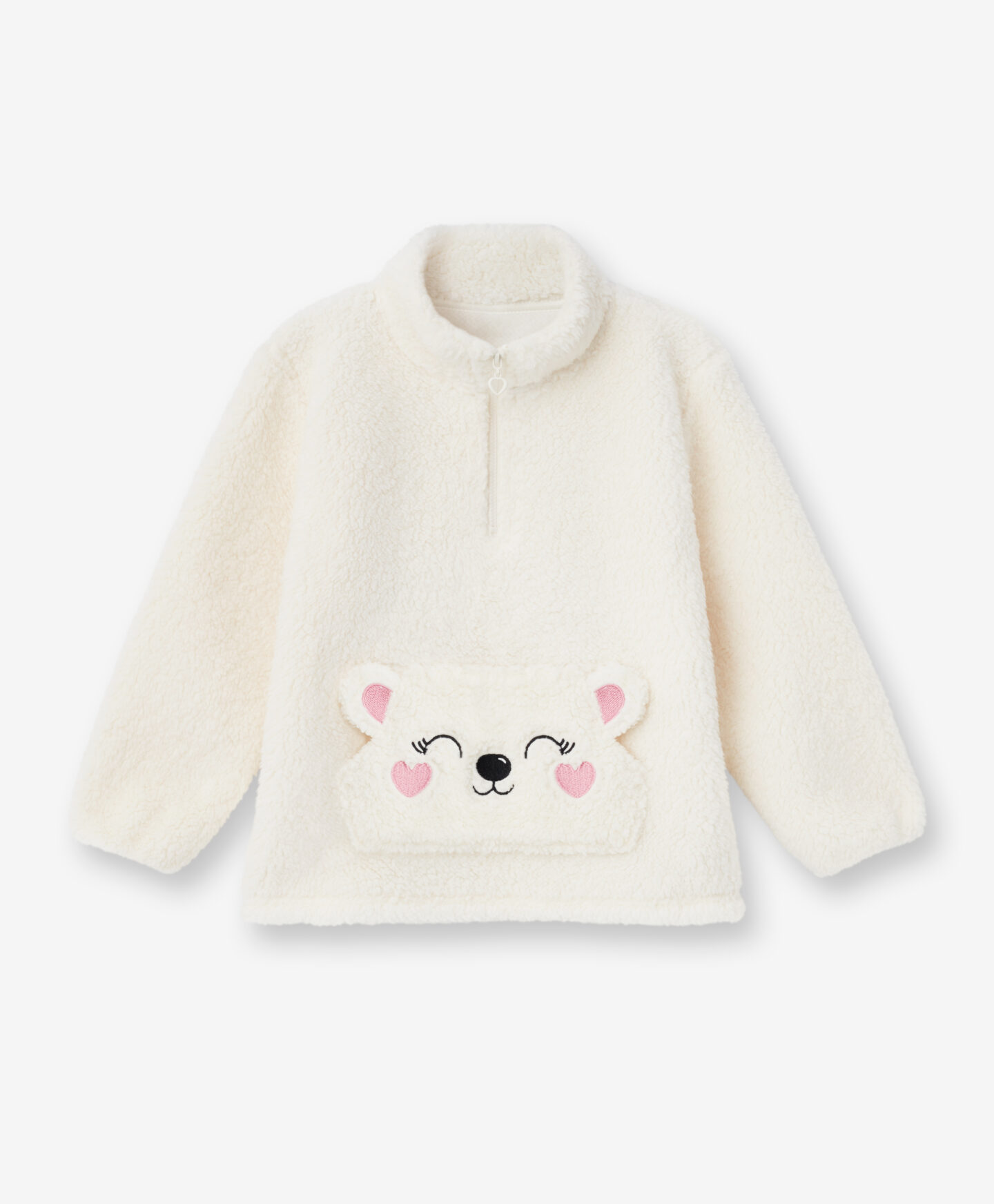 Dievčenská biela mikina sherpa je ideálna pre malé milovníčky pohodlia. Zapínanie na krku uľahčuje dieťaťu samostatné obliekanie a vyzliekanie mikiny. Klokanie vrecko s roztomilým medvedíkom a 3D prvkami zahreje studené ruky v chladných dňoch. Voľný strih zaisťuje pohodlie pri nosení a príjemný materiál poskytuje teplo. Ideálna na zimné večery doma alebo na vonkajšie aktivity.
