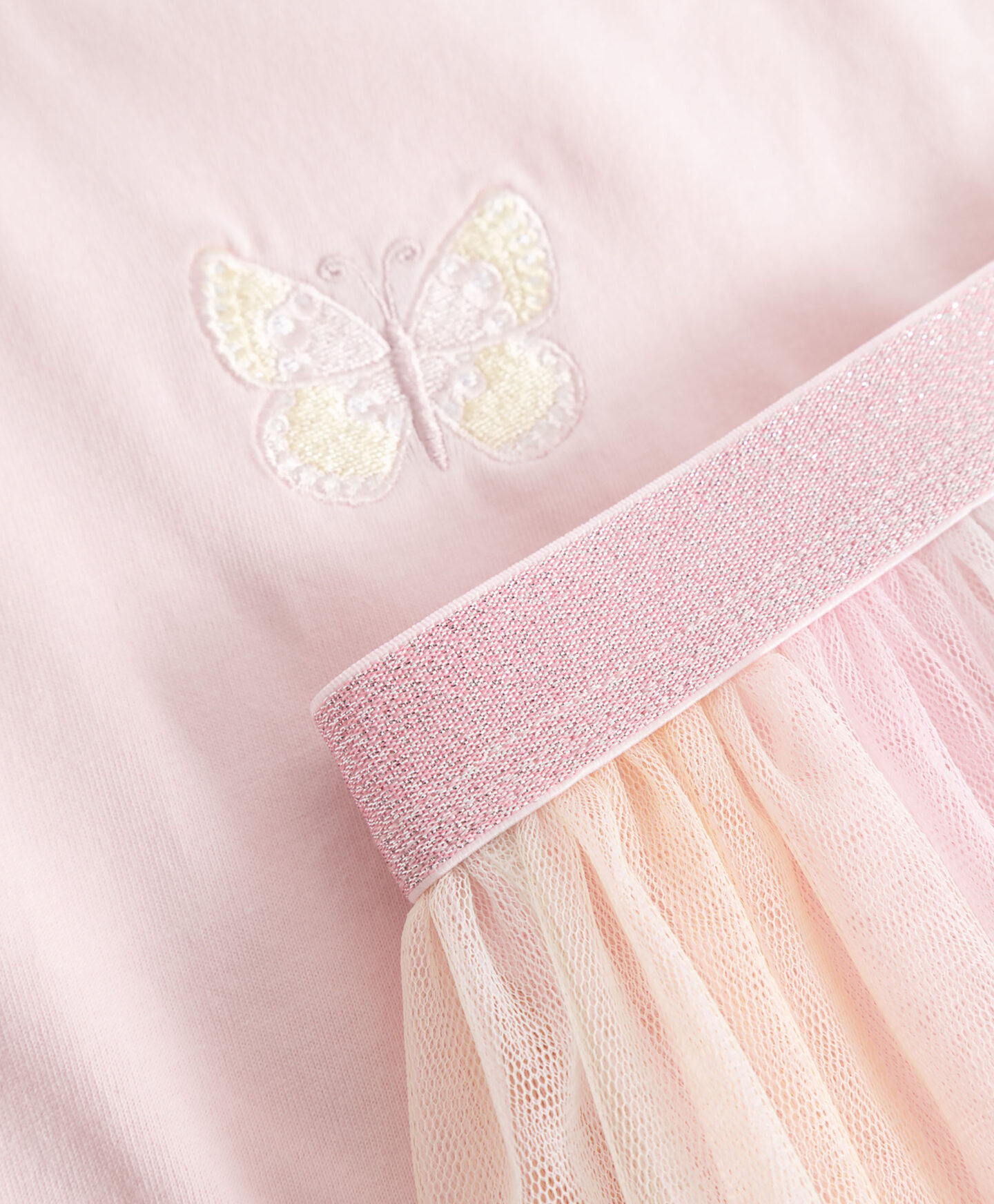 Táto dievčenská súprava je taká vzdušná, že sa v nej každé dievčatko bude cítiť ľahké ako motýľ. Krátka blúzka so širokými rukávmi a rovným strihom zaručuje voľnosť pohybu. Vyšívaný motýlik na prednej strane dodáva nádych jemnosti. Splývavá sukňa z ľahkého a vzdušného tylu bude krásne viať vo vetre. Pohodlný elastický pás zaisťuje dokonalé prispôsobenie.