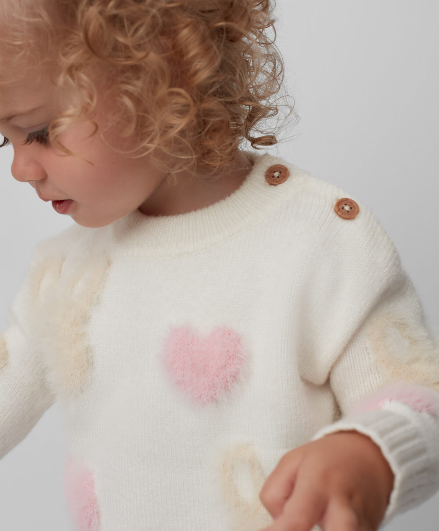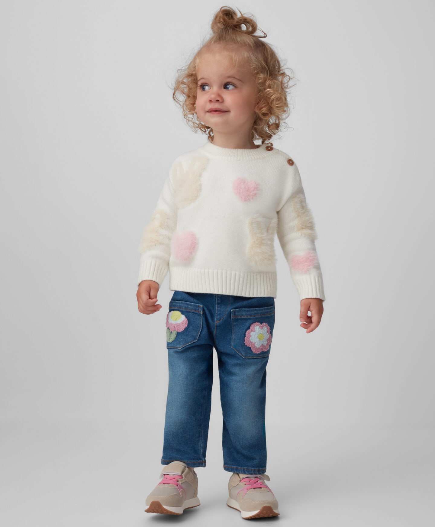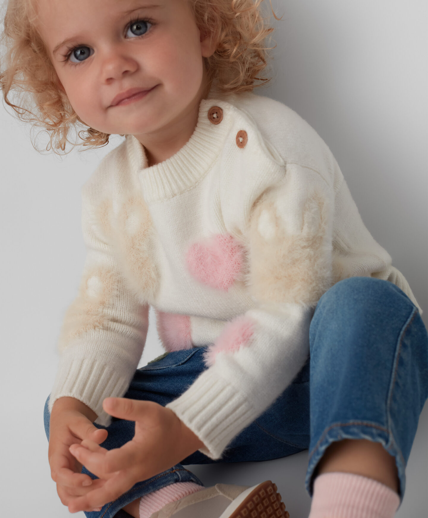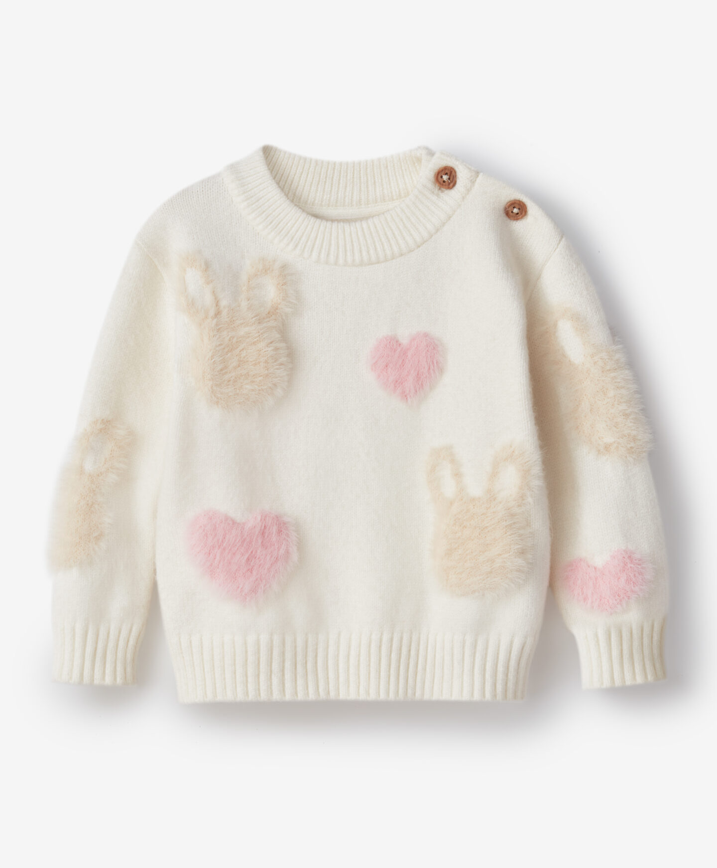 Dievčenský pulóver so zapínaním na gombíky je pohodlnou voľbou na každý deň. Zapínanie na gombíky uľahčuje obliekanie vášho drobčeka a vzor zajačika a srdiečok dodá šarm každému outfitu. Pulóver je hrejivý, mäkký a príjemný na dotyk.