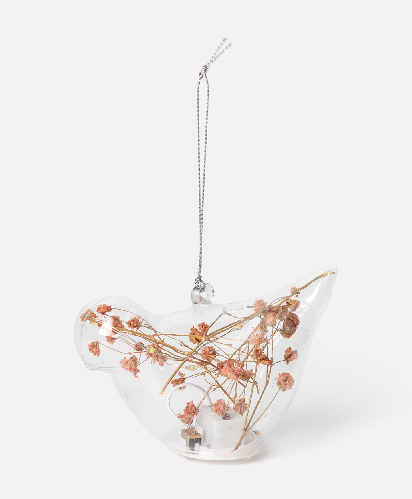 LED sklenená závesná dekorácia – vtáčik s gypsomilkou