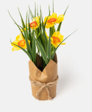 Umelé žlté kvety v papierovom kvetináči sú perfektným riešením pre tých, ktorí hľadajú odolnú dekoráciu pripravenú ihneď na použitie. Ich sýte farby a verné detaily vytvárajú svieži a žiarivý vzhľad. Na výber sú tri dizajny.