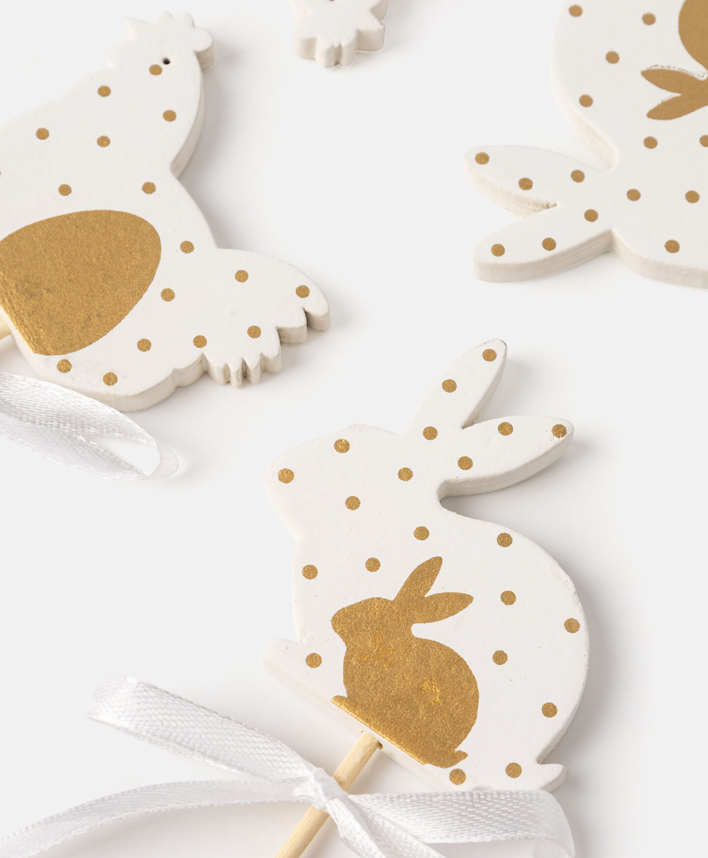 Zapichovacie dekorácie 4 ks v tvare sliepok a zajačikov s mašličkami je elegantná dekorácia inšpirovaná veľkonočnými symbolmi. Ideálne na zdobenie košíkov, kvetináčov alebo kytíc. Rôzne prevedenia na výber.